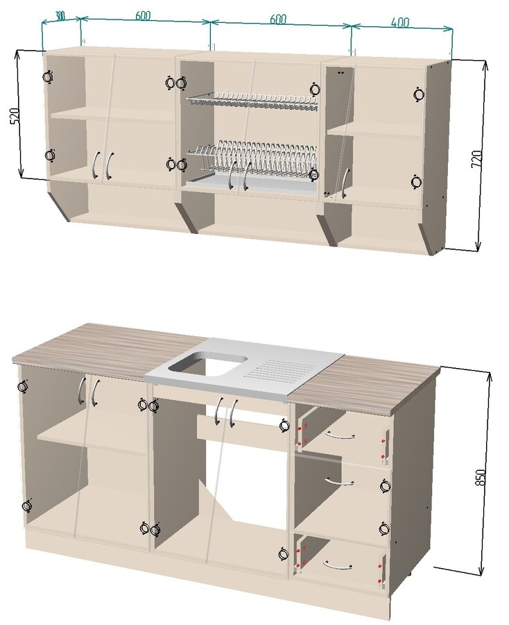 Кухонный гарнитур "Ирбея 5.6" выпускается секциями, с накладной мойкой.