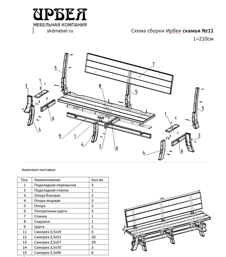 Главная/ Мебель Ирбея / Мебель из дерева / Комплект Ирбея №11 / Скамья Ирбея №11 L-210 на 3-х опорах (массив сосны, старение)